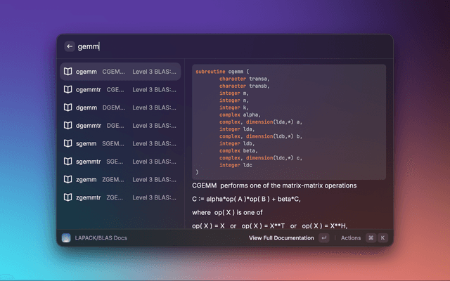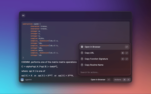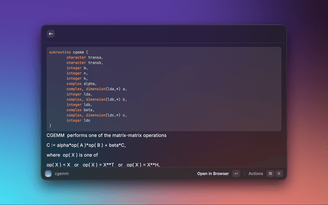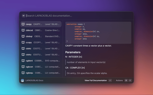 Quickly search through official LAPACK/BLAS documentation directly from Raycast.