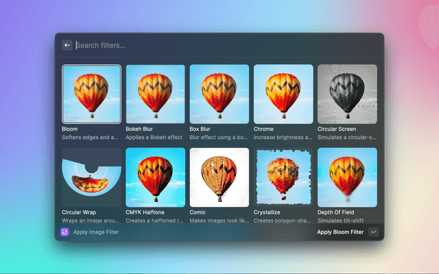 • Apply filters and distortions such as Bokeh Blur, Noir, X-Ray, and more