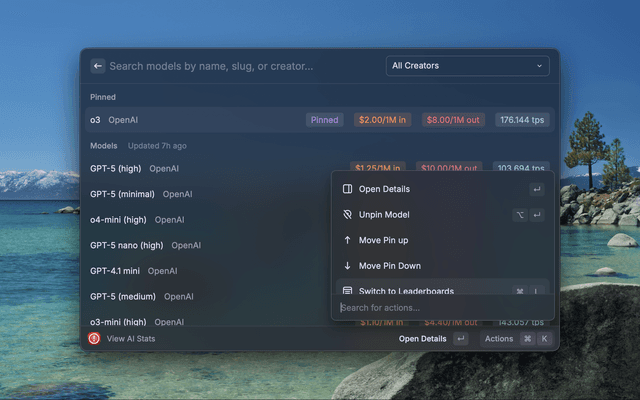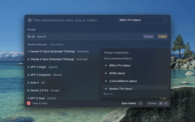 A Raycast extension that provides quick access to AI model statistics & leaderboards. It syncs with ArtificialAnalysis.ai's API for model data. Search models, view benchmark results, compare prices, and check leaderboards all without leaving Raycast.
