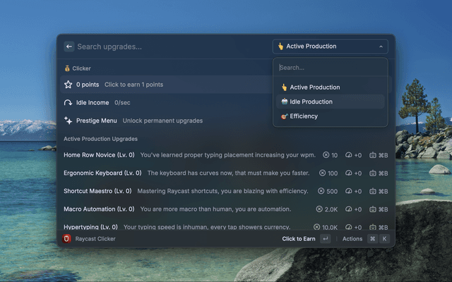 A simple idle clicker game for Raycast with upgrade, made as a learning exercise for Raycast extensions development.