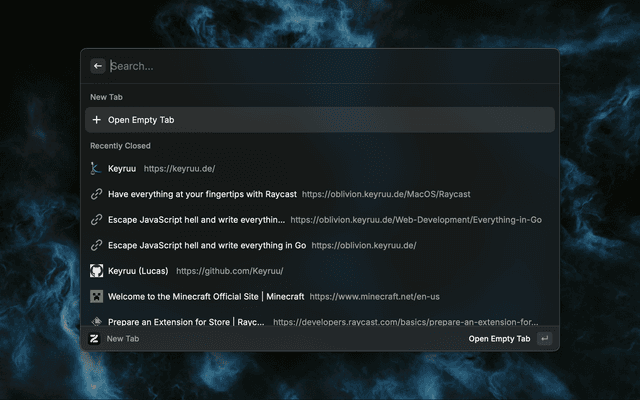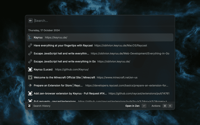 Search and open Zen Browser tabs from search query, opened tabs, bookmarks and history.