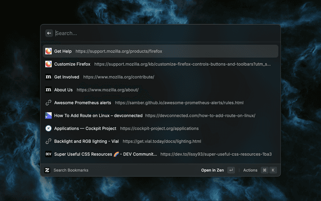 Search and open tabs from bookmarks and history in Zen Browser.