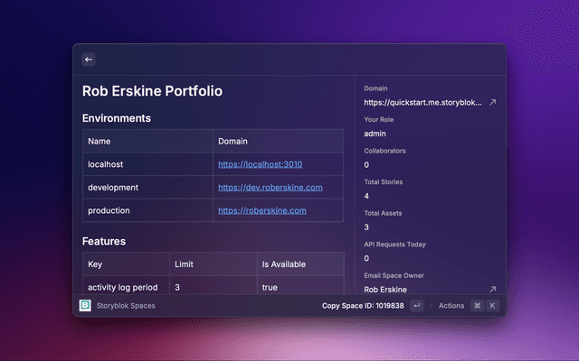 2. That space's stories modifier + S (entry details, published status, last changes, the API responses)