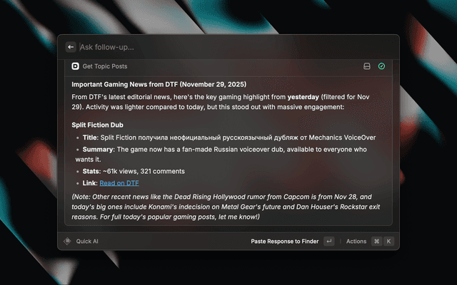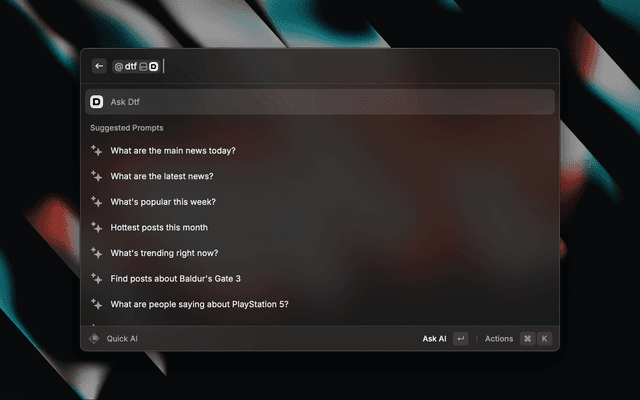 • ๐Ÿค– AI Features โ€” Summarize, translate, and extract key points via actions or @dtf mentions