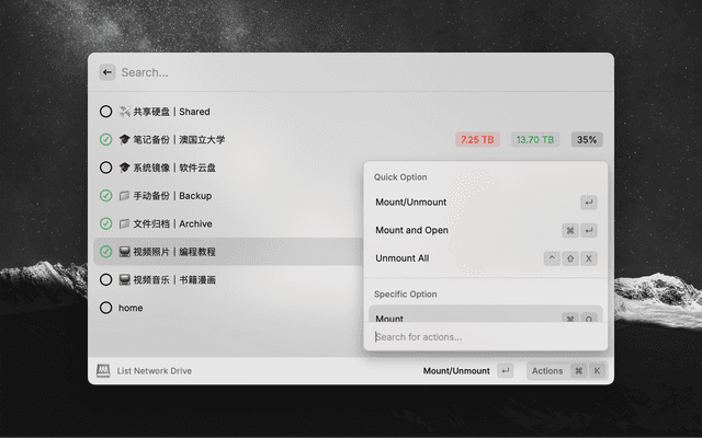 List the available drive of a specified IP address (via SMB), mount and unmount those drives.