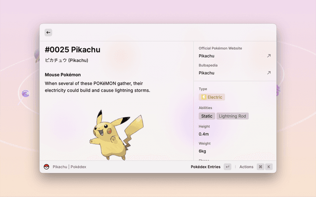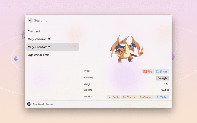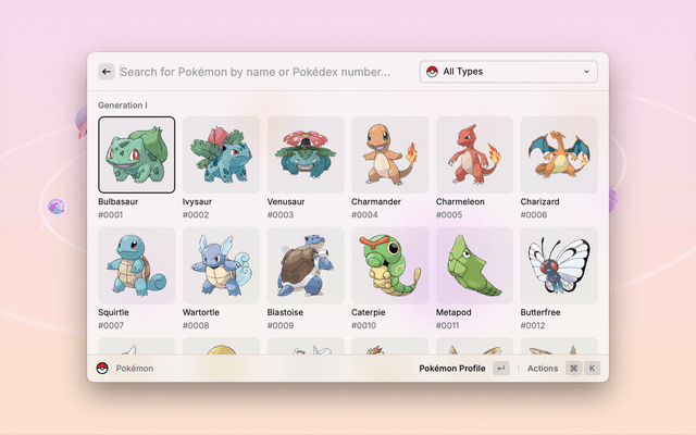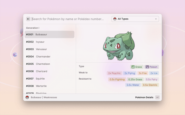 Explore the world of Pokémon with stunning visuals and detailed information in Raycast.