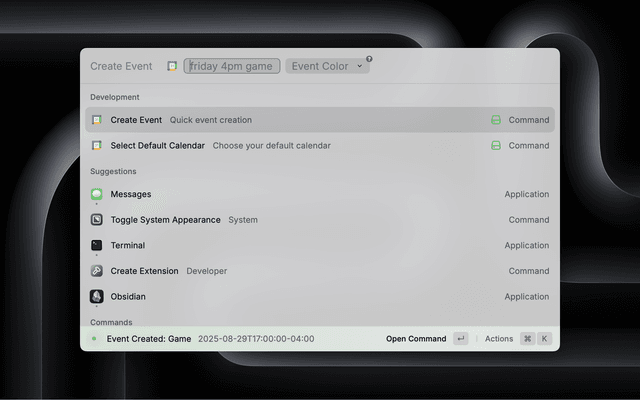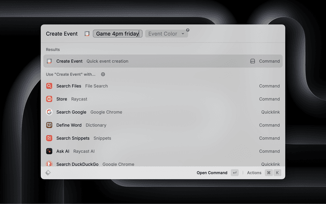 • Raycast AI-Powered Parsing: Automatically extracts dates, times, and locations from your input using Raycast AI