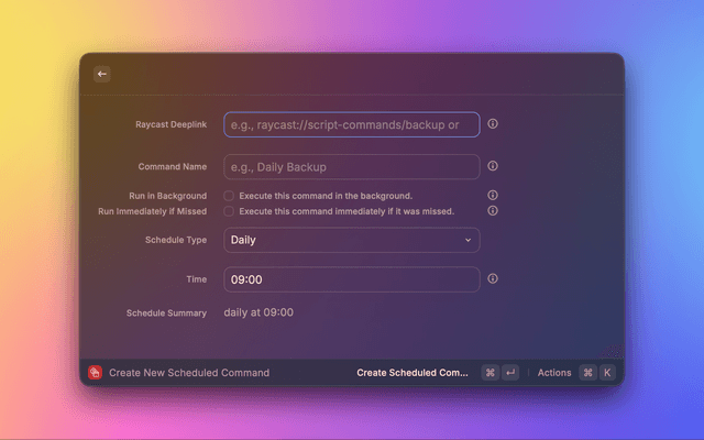 • Command: Paste the Raycast deeplink of the command you want to schedule