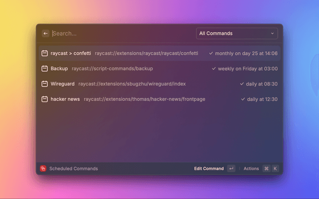 Allows you to schedule Raycast commands to run at specific days, times or intervals ⏰.