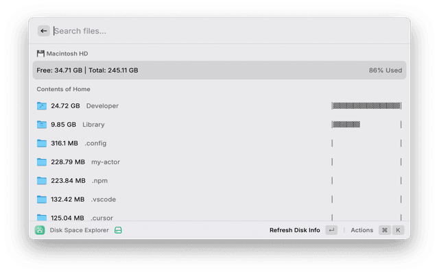 Analyze disk space usage and identify large files and folders in your home directory. This extension helps you quickly find what's taking up space on your Mac.