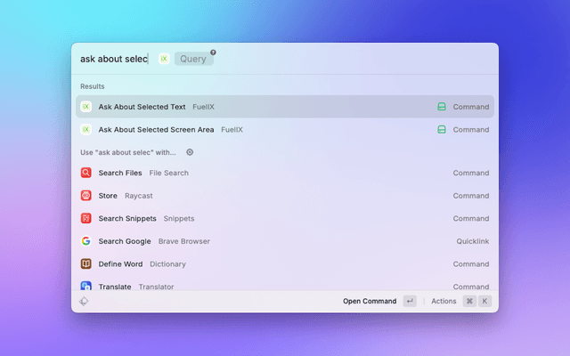 Capture a screenshot of a specific selected area of your screen and ask Fuelix AI about that particular region. This allows for more focused analysis of specific parts of your screen - perfect for analyzing particular windows, sections, or UI elements.