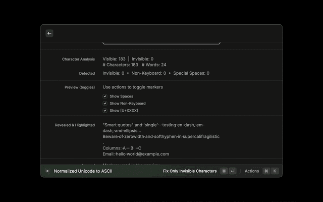 • Fix Invisible Characters: No‑view quick cleaner that operates on selected text or clipboard using your default mode.