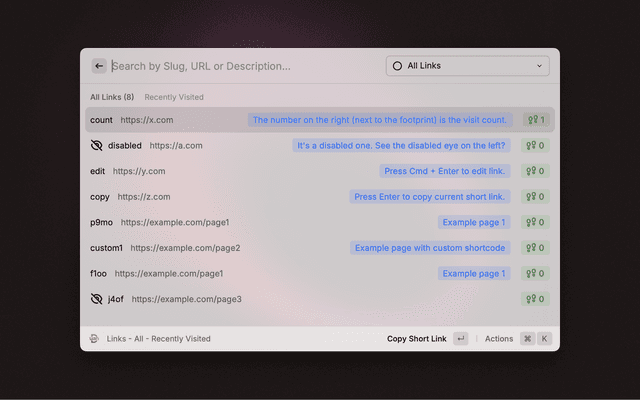 • ⌘ ⇧ ↓ - Move pinned link down (only for pinned links)