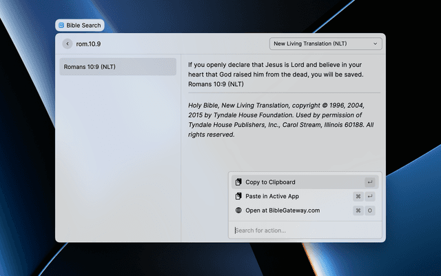 Instant access to the Word of God, right from your Raycast command bar. Search, read, and share Bible passages with speed and convenience.