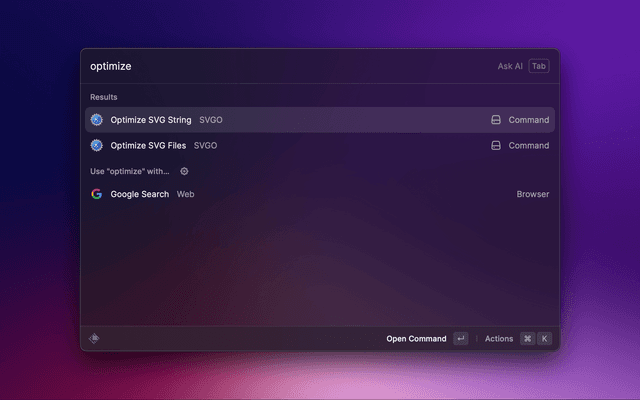 Optimize SVG vector graphics files with SVGO in Raycast.