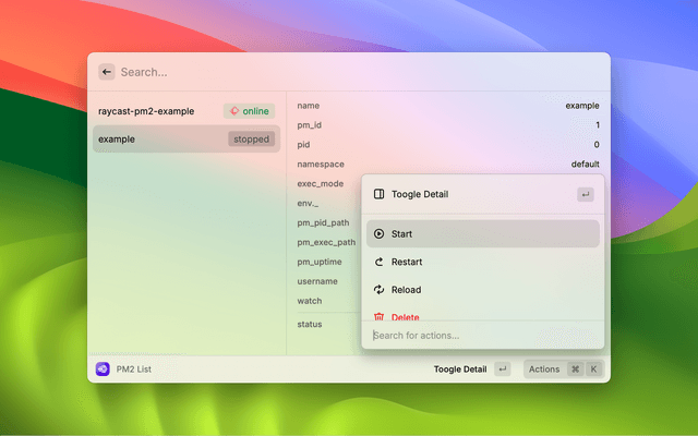 This extensions follows Raycast Cross-Extension Conventions. You can send Node.js application to PM2 through crossLaunchCommand.