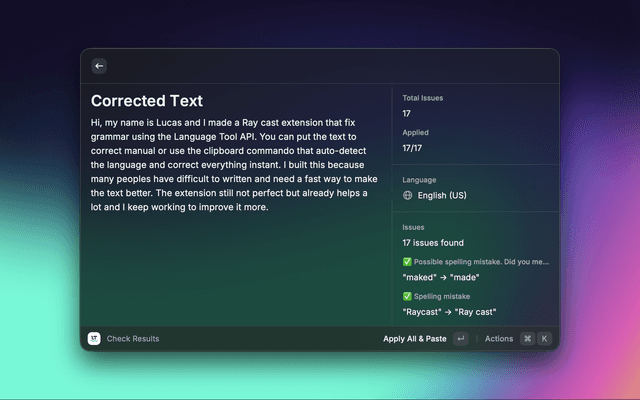 ββ΅ - Apply all corrections and pasteββ§A - Apply all correctionsβR - Reset correctionsβC - Copy corrected textPerfect for quick corrections while writing emails, documents, or messages.