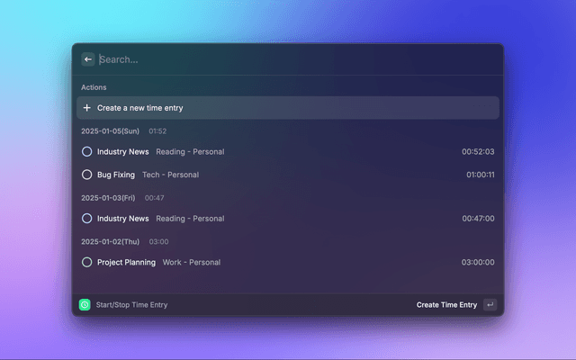 - By pressing "Enter" on a time entry, you can start/stop the time entry.