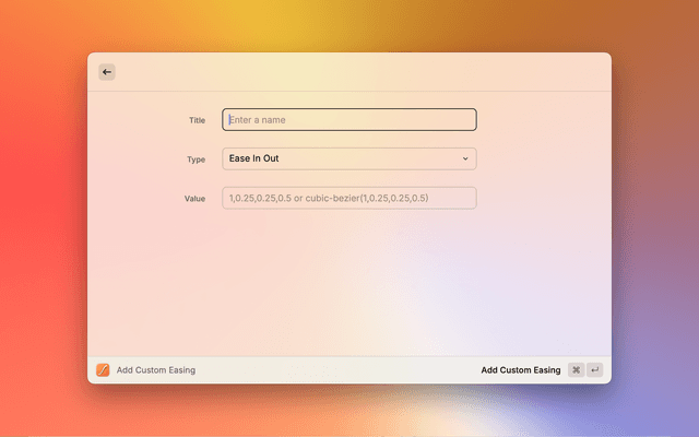 • Built-in Easings: Access to common cubic-bezier easings (ease-in, ease-out, ease-in-out)
