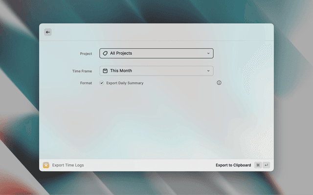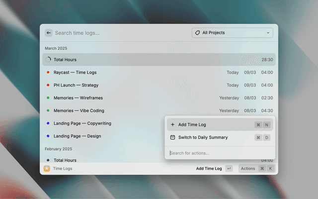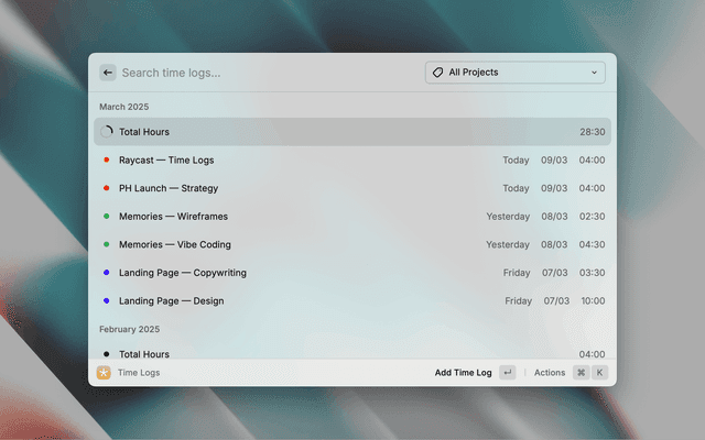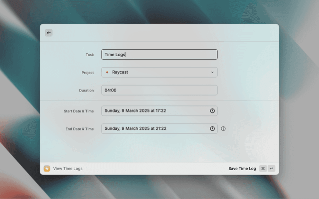 Track, manage, and export time logs on tasks and projects with this simple and powerful Raycast extension.