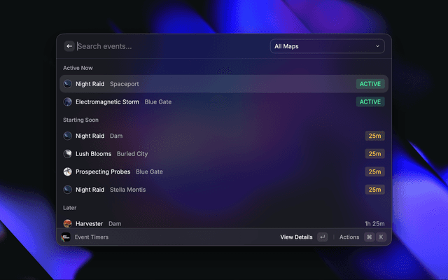 | Event Timers | View active/upcoming events sorted by time, filterable by map |