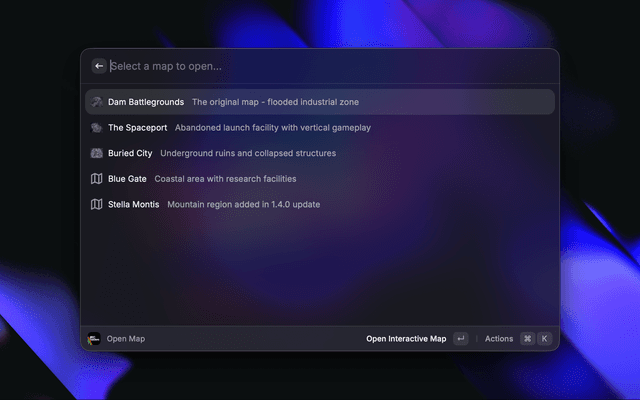 | Open Map | Quick access to interactive maps (Dam, Spaceport, Buried City, Blue Gate, Stella Montis) |