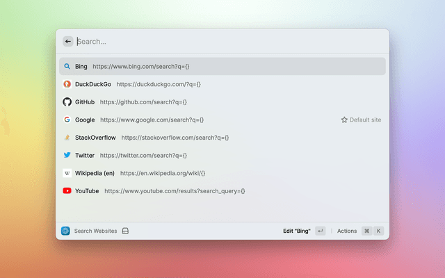 2. Enter the site's template URL. This is a URL whose search query is replaced with curly braces, e.g., https://website.com/?q={}. The curly braces indicate where your search query goes; when run, {} will be replaced with your (URL-encoded) search term.