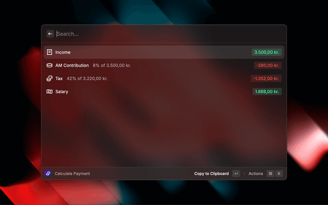 A Raycast extension to quickly calculate your payment after taxes in Denmark.