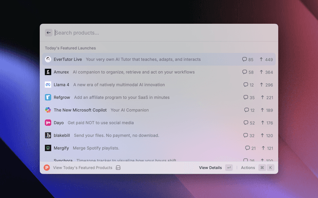 Browse and discover the latest products on Product Hunt directly from Raycast.