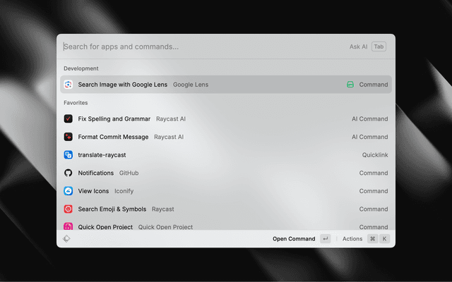 A seamless Google Lens image search extension built specifically for Raycast. With this tool, you can quickly search using screenshots or images selected in Finder no complicated steps required.