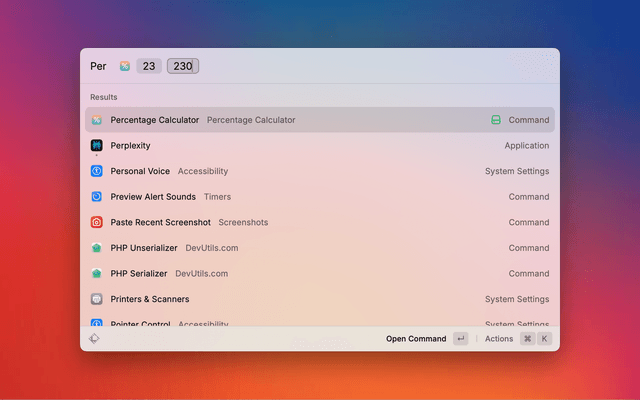 A comprehensive percentage calculator for Raycast that provides a Full Statistics view with colorful card-based results. Enter any two values and get a complete breakdown of all possible percentage calculations in one go!