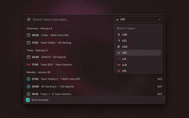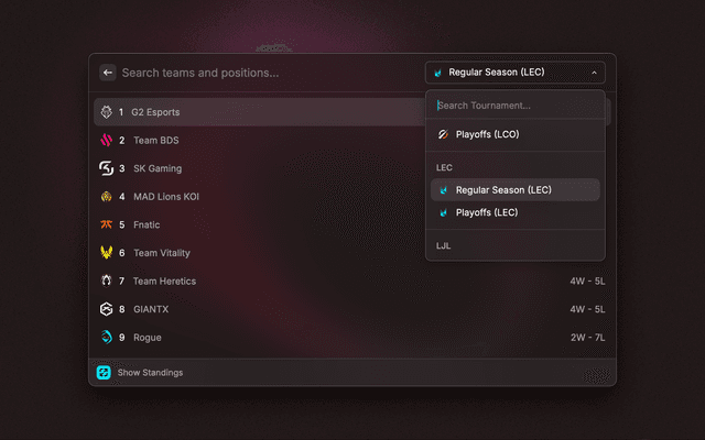 Search League of Legends esports schedules and standings.