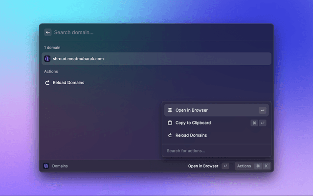 This is a Raycast extension for Shroud.email. With this extension, you can View Domains and Create or View Aliases in your Shroud.email instance.