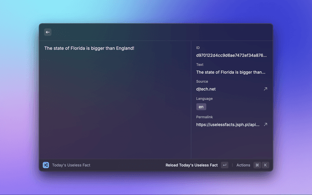 This is a Raycast extension to get useless but true facts via Useless Facts.
